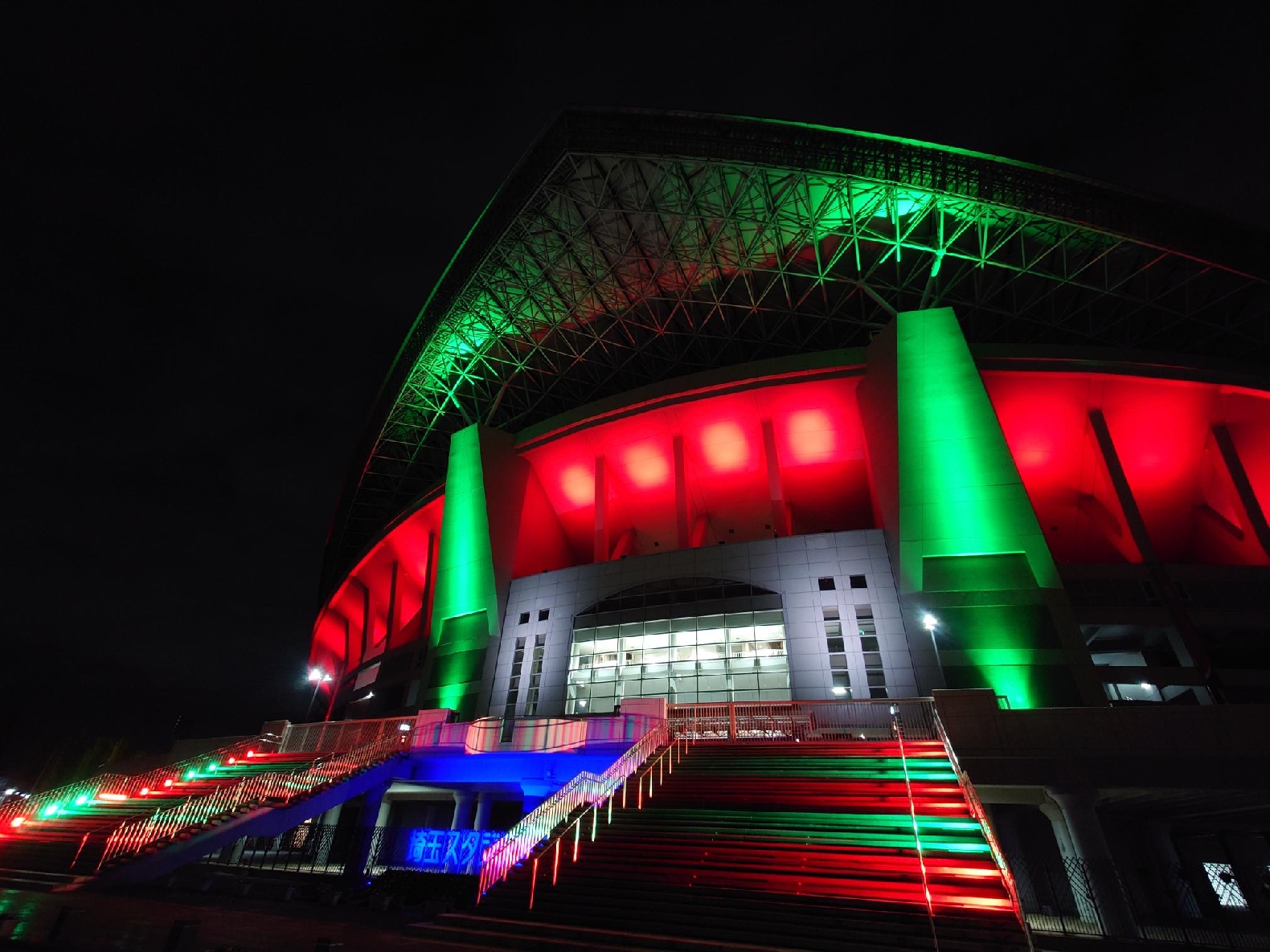 埼スタがクリスマス期間に、クリスマスライトアップとイルミネーションで光ります。