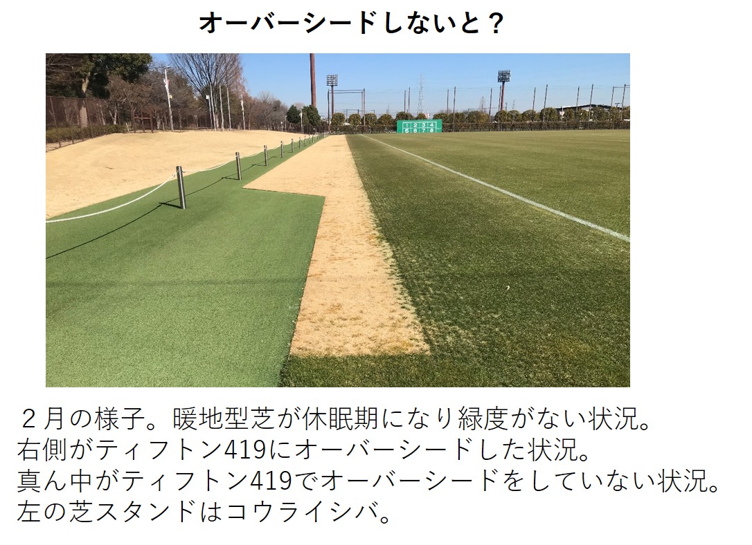 屋根がなく太陽光をたっぷり浴びる第3グラウンドでは、暖地型芝のティフトン419をベースに、秋に寒地型芝の種をまくWOS方式で管理されています。