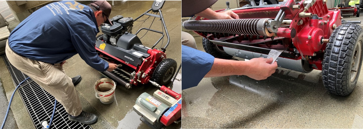 芝刈機は葉のダメージ回復や仕上がり後の美しさの点で、鋭利でよく切れる刃である必要があります。そこで芝刈機の使用後には必ず洗浄して「ラッピング」と呼ばれる研磨作業を行います。リール刃(回転刃)とベットナイフ(下刃)の嚙み合わせや切れ味を新聞紙を使って確認したあと、コンパウンドという研磨剤を塗布します。リール刃は専用の機械で逆回転させて、二つの刃のすり合わせで研磨されていきます。
