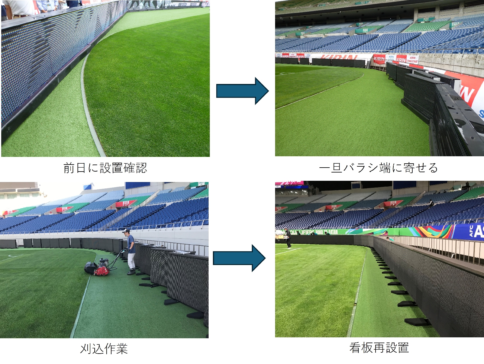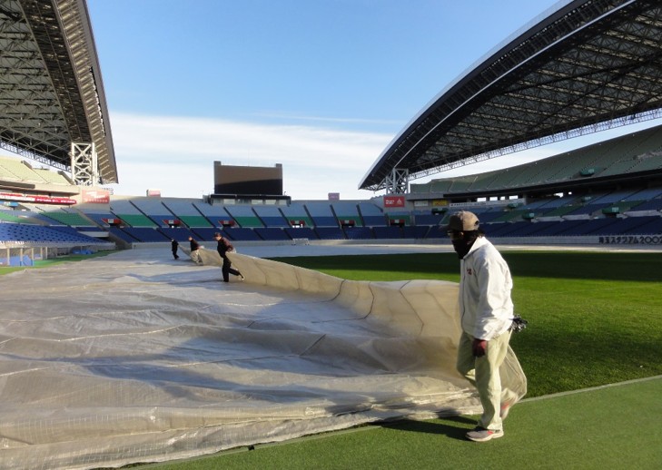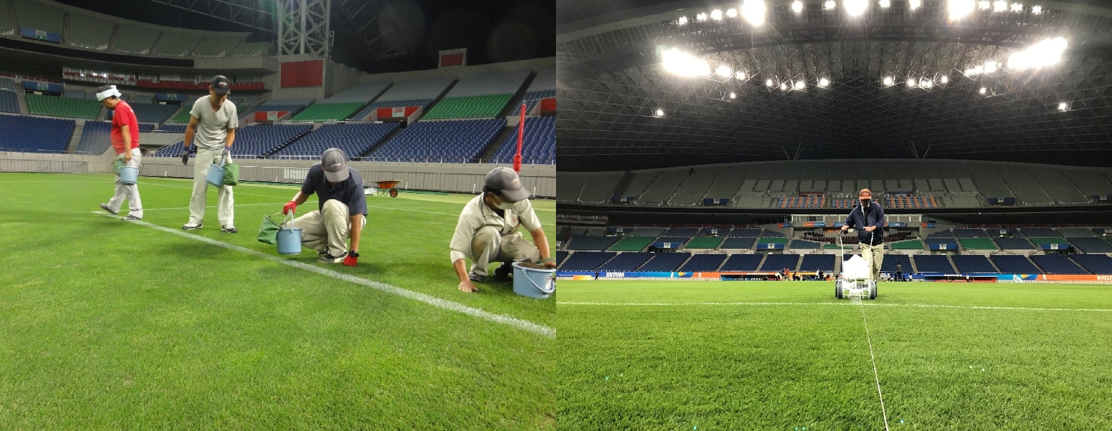 例えば、キックオフが19時の場合は、前日の同時刻に前日練習が行われるため、練習終了後から夜間にかけて芝生の補修作業(キズの修復など)を行い、翌日の試合当日には通常の試合前作業を実施します。