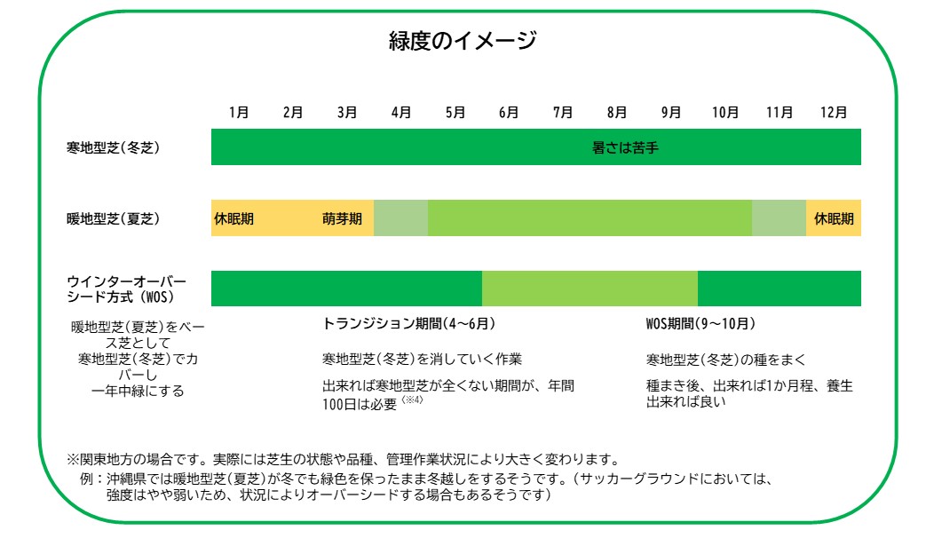 特に日照不足が常態化しているスタジアムにおいては、ウインターオーバーシード(WOS)方式による管理が非常に難しくなります。暖地型芝は寒地型芝との競合に敗れやすく、管理が困難になるのです。WOS方式で暖地型芝が単独で生育できるのは、管理状況にもよりますが、概ね7月から9月の約3カ月間に限られます。それ以外の期間は寒地型芝に支えられており、5〜6月はトランジション期間、WOS終了後の約1カ月は移行期間として両種の芝が共存します。ただし、日照条件が特に悪いスタジアムではこのサイクルも成立しない場合があります。