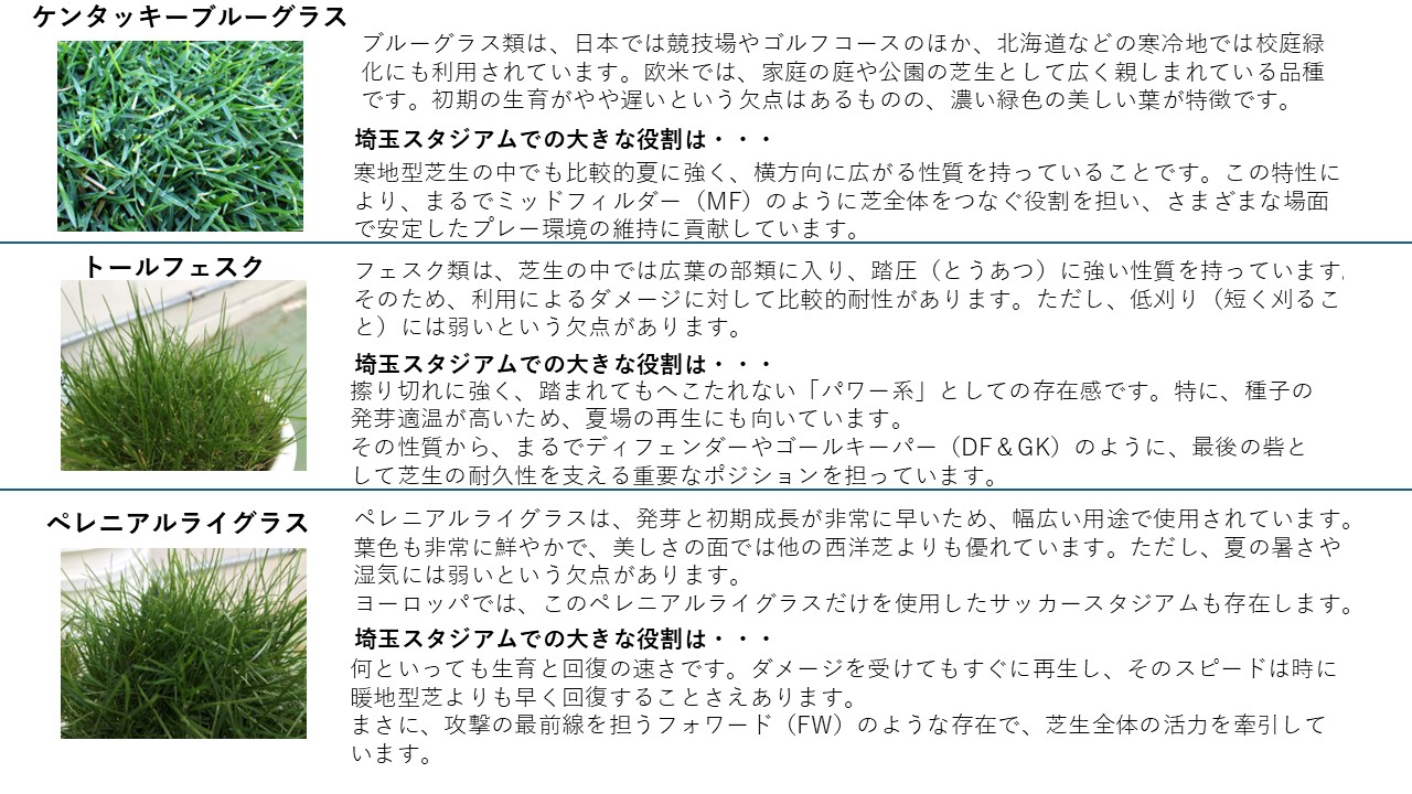 埼玉スタジアムのピッチで採用されている芝生は、一年中緑を保てる寒地型芝生です。使用している品種は、ケンタッキーブルーグラス・トールフェスク・ペレニアルライグラスの3種類。それぞれの特性を活かし、弱点を補う構成になっています。