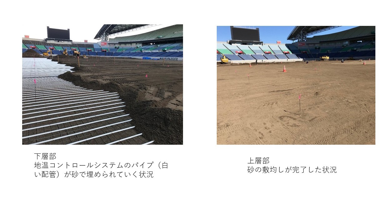 さらに、その砂層の約25cm下には、埼玉スタジアムの特徴の一つである地温コントロールシステムのパイプが埋設されています。これにより、芝生の温度環境を適切に管理し、通年を通じた高品質なピッチコンディションを維持しています。