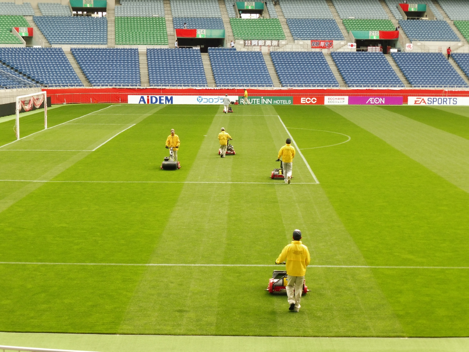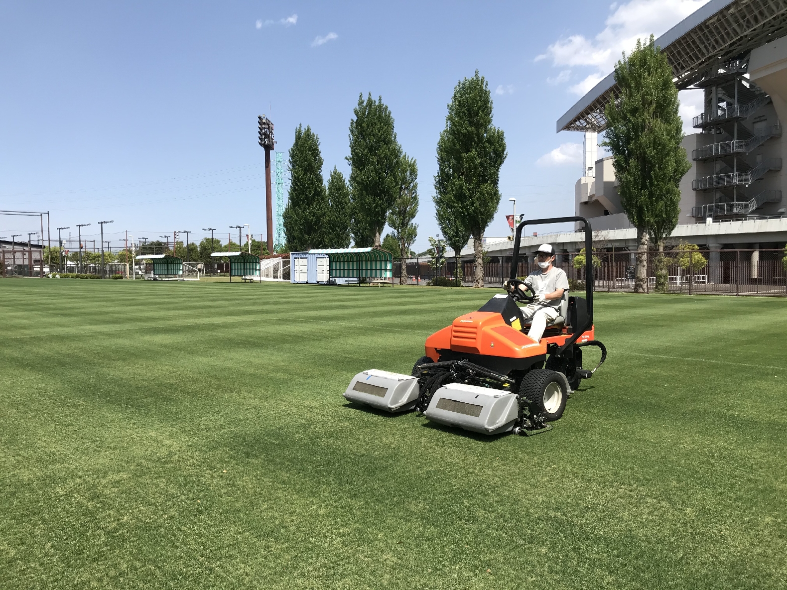 一般的なサッカーグラウンドでは、乗用の芝刈り機を使うことが多いです。