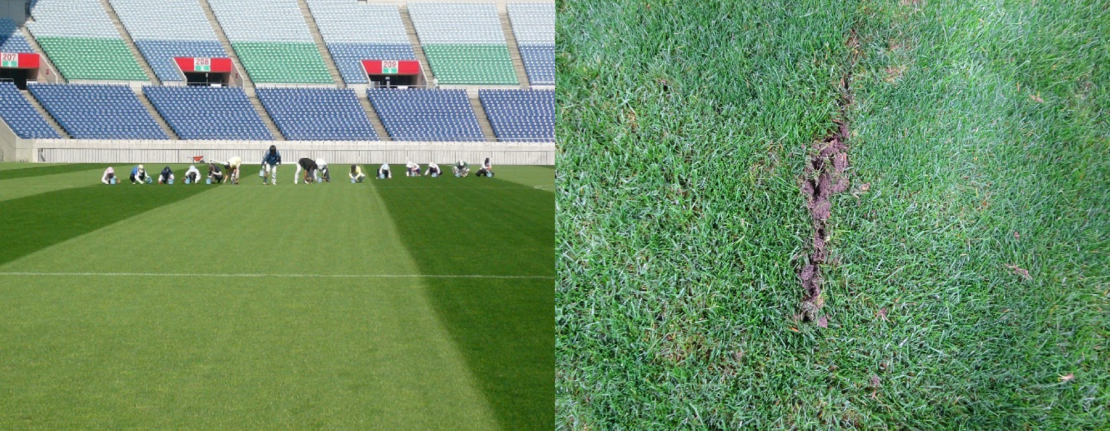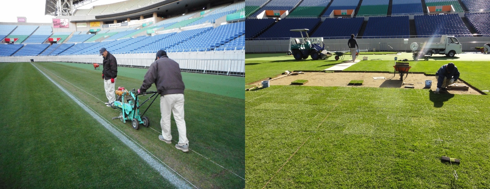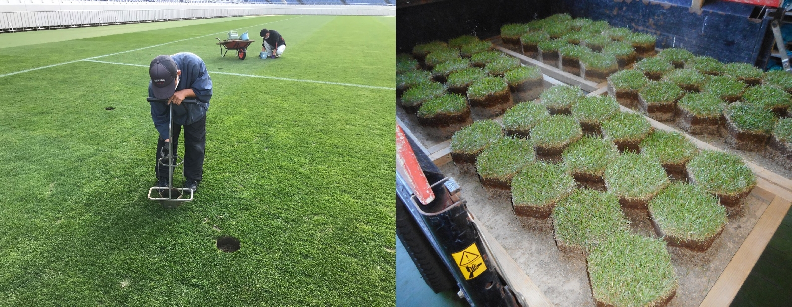 40cm×35cmに抜き取って植えることにより、均一なピッチにしています。主にオフシーズンにゴール前、アシスタントレフェリー走路等を部分的に張り替えることが多いです。