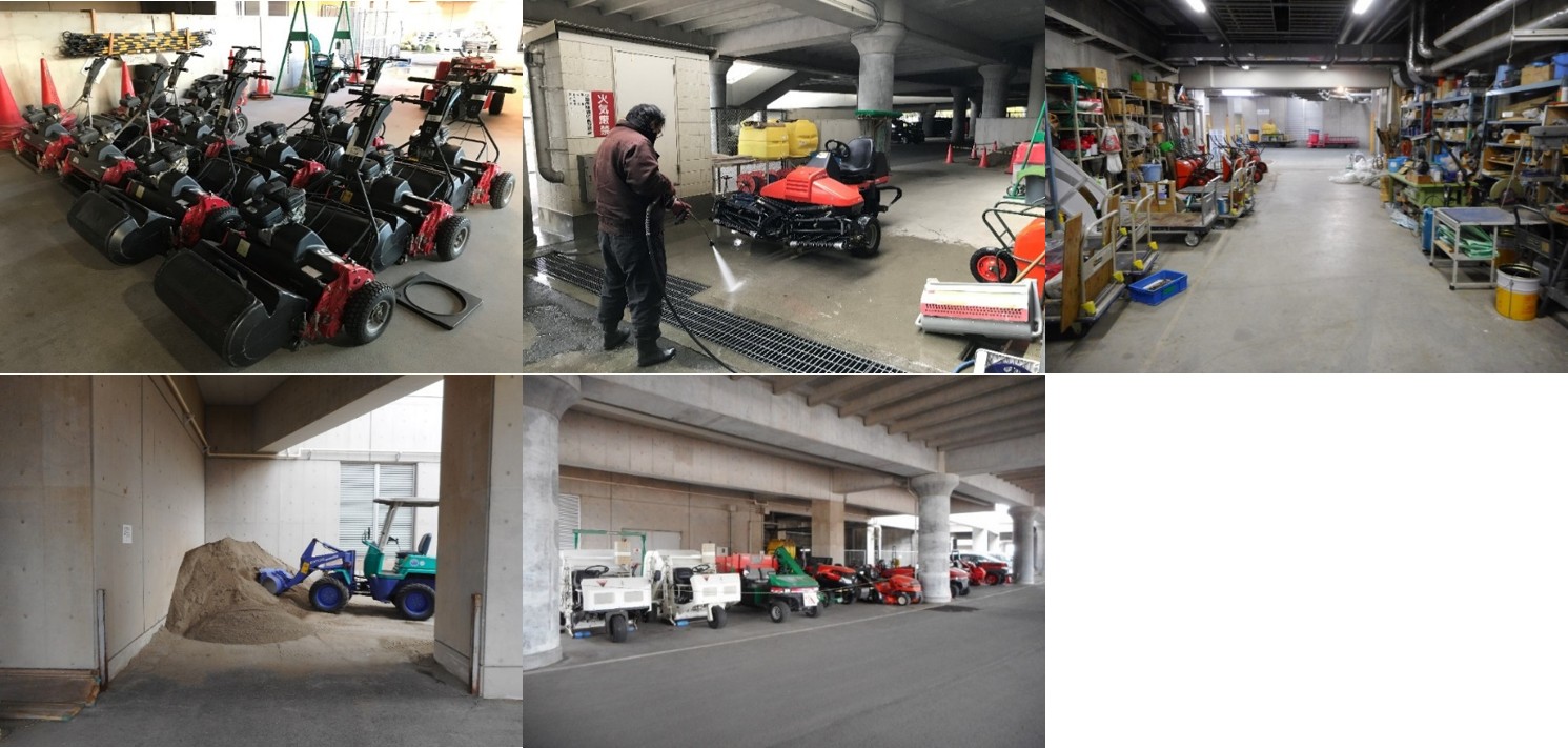 芝生管理には、機械や道具の洗い場、機械置き場、資材置き場、整備用の砂置き場、残土置き場などが必要です。