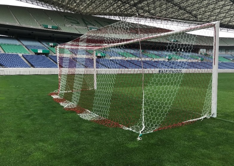 浦和レッズ戦で使われていた旧式のゴールネットです。VAR(ビデオ・アシスタント・レフェリー)の判定に影響が出る可能性があるため、現在は赤一色に統一されたネットが使われています。